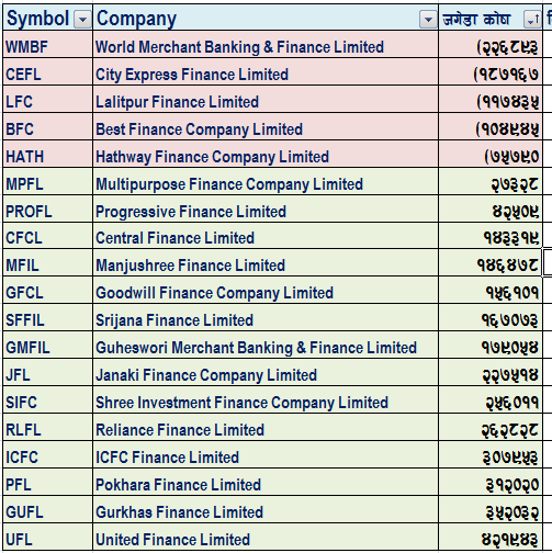 फाइनान्स कम्पनीहरु मध्ये ५ फाईनान्स कम्पनीहरुको जगेडा कोष ऋणात्मक छ। वोर्ल्ड मर्चेन्ट, सिटि एक्सप्रेस, ललितपुर फाइनान्स, बेस्ट फाइनान्स र हाथ्वे फाइनान्सको जगेडा कोष ऋणात्मक छ।  जगेडा कोष ऋणात्मक भएका कम्पनीहरुमा लगानीकर्ताहरुले प्रतिफल पाउने सम्भावान एकदम न्यून हुन्छ।