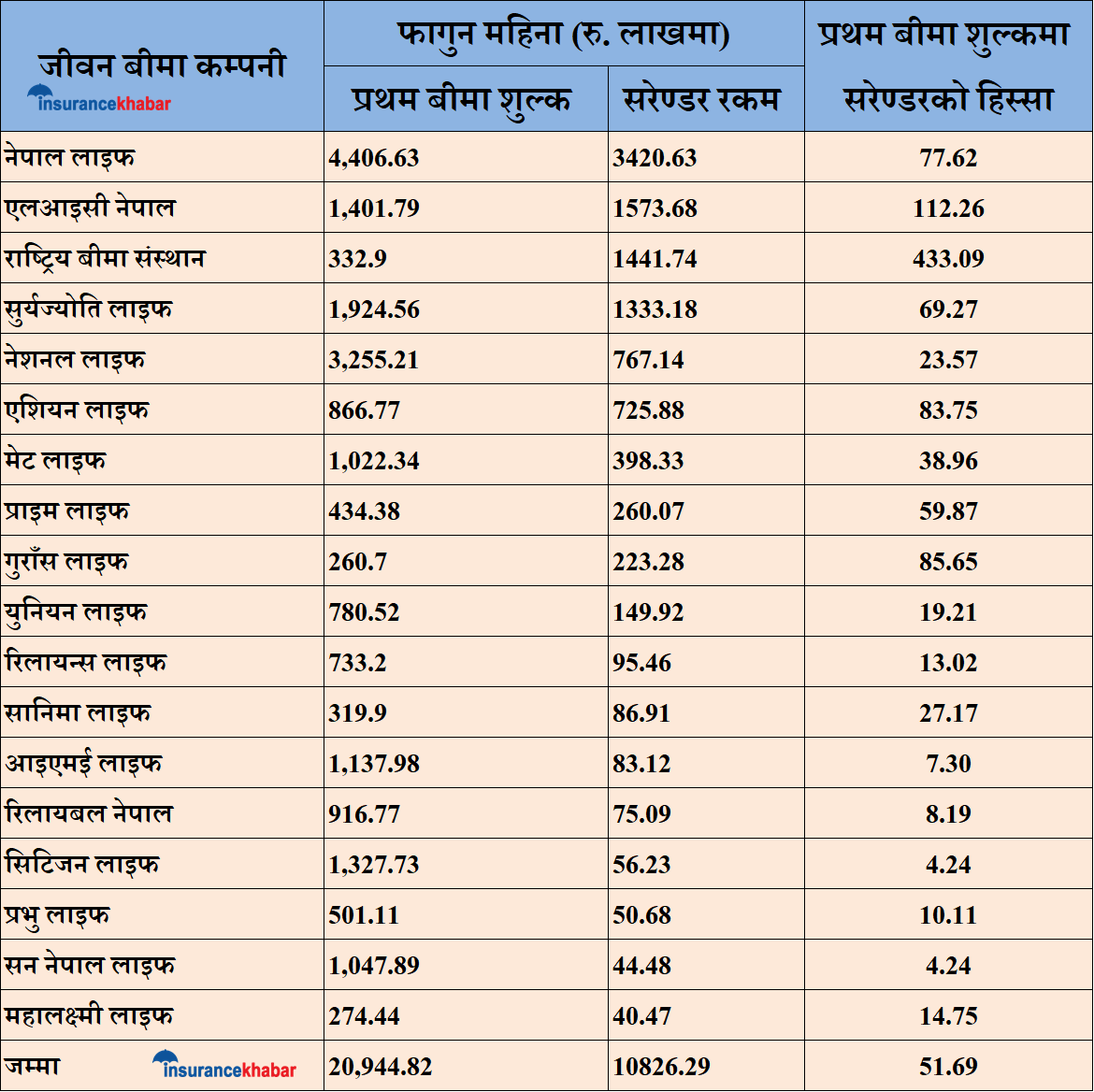 फागुन महिनामा सर्वाधिक धेरै नेपाल लाइफमा ३४ करोड २० लाख रुपैयाँको सरेण्डर भएको छ । जवकी कम्पनीले यहि महिनामा ४४ करोड ६ लाख रुपैयाँ प्रथम बीमा शुल्क आर्जन गरेको छ । वैदेशिक रोजगार बीमालेखबाट आर्जन भएको बीमा शुल्कलाई घटाउने हो भने सरेण्डरको हिस्सा ९२ प्रतिशत हुन्छ । यसरी फागुन महिनामा नेपाल लाइफमा बीमा शुल्क भित्रिने भन्दा पनि बाहिरिने क्रम धेरै देखिएको छ । जुन कम्पनीका लागि धेरै नै हानिकारक छ । एकातिर सरेण्डर अर्को तर्फ प्रथम बीमा शुल्क आर्जनमा लगातार गिरावटले कम्पनी खोक्रो हुँदै गइरहेको छ ।