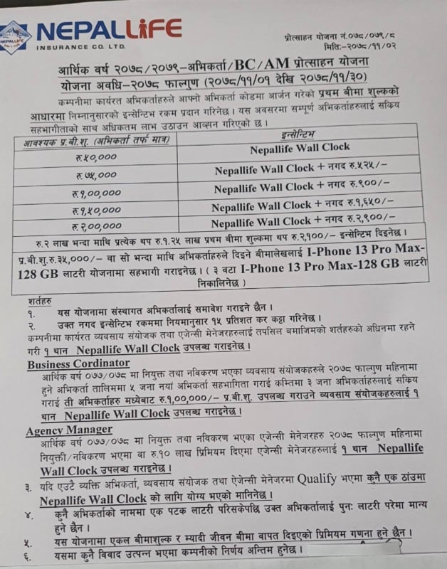 कम्पनीले ३५ हजार रुपैयाँ वा सो भन्दा माथिको प्रथम बीमा शुल्क आर्जन गर्ने अभिकर्ताहरु मध्ये तीन जनालाई आइफोन १३ प्रो म्याक्स १२८ जिविको मोबाइल फोनका लागि लाटरीमा समावेश गराउने छ । यो योजनामा संस्थागत अभिकर्तालाई समावेश गराइने छैन । नगद इन्सेन्टिभ रकममा नियम अनुसार १५ प्रतिशत कर कट्टि हुने छ । त्यस्तै यस योजनामा एकल बीमाशुल्क र म्यादी जीवन बीमा बापत दिइएको प्रिमियम गणना हुने छैन ।