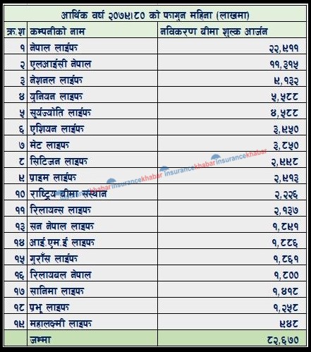 प्राधिकरणको तथ्याङक अनुसार फागुन महिनामा सबैभन्दा धेरै नेपाल लाइफले नविकरण मार्फत बीमा व्यवसाय भित्राएको देखिन्छ । कम्पनीले यस महिनामा नविकरण मार्फत २ अर्ब २९ करोड रुपैयाँ बीमा शुलक आर्जन गरेको छ । एलआइसी नेपालले नविकरण मार्फत १ अर्ब १३ करोड रुपैयाँ बीमा शुल्क आर्जन गरेको छ । नेशनल लाइफले ९१ करोड ३२ लाख रुपैयाँ नविकरण मार्फत बीमा शुलक आर्जन गरेको छ ।
