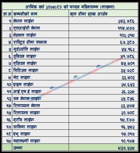 सन नेपाल लाइफले २ अर्ब ५८ करोड, रिलायबल नेपाल लाइफले २ अर्ब ३५ करोड, रिलायन्स लाइफले २ अर्ब ७ करोड, गुराँस लाइफले १ अर्ब ९८ करोड, सानिमा लाइफले १ अर्ब ६५ करोड, प्रभु लाइफले १ अर्ब ४० करोड र महालक्ष्मी लाइफले १ अर्ब १ करोड रुपैयाँ कुल बीमा शुल्क आर्जन गरेका छन् ।