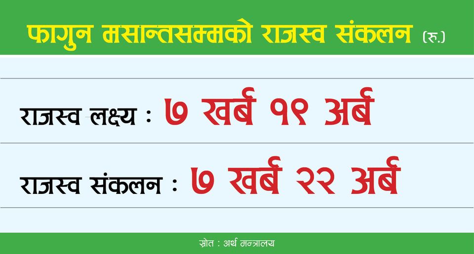 काठमाडौं । नेपाल सरकारले फागुन मसान्तसम्ममा राजस्व संकलन लक्ष्य भन्दा धेरै गरेको छ । अर्थमन्त्री जनार्दन शर्माले फेसबुक पेज मार्फत नेपाल सरकारले फागुन मसान्तसम्ममा ७ खर्ब २२ अर्ब रुपैयाँ राजस्व संकलन गरेको उल्लेख गरेका छन् । सरकारले यहि अवधिमा ७ खर्ब १९ अर्ब रुपैयाँ संकलन गर्ने लक्ष्य राखेको थियो ।