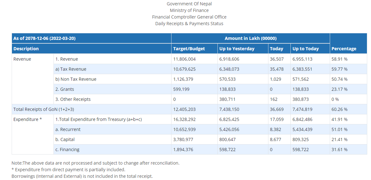 दैनिक बजेटरी प्रणाली अनुसार हिजो आइतबारसम्ममा नेपाल सरकारले राज्यव मात्रै ६ खर्ब ९५ अर्ब रुपैयाँ संकलन गरेको छ । जसमा कर मार्फत ६ अर्ब ३८ अर्ब, गैर कर मार्फत ५७ अर्ब १५ करोड रुपैयाँ रहेको छ । त्यस्तै अनुदान बापत १३ अर्ब ८८ करोड रुपैयाँ प्राप्त गरेको छ भने अन्य आम्दानी ३८ अर्ब रुपैयाँ रहेको छ ।
