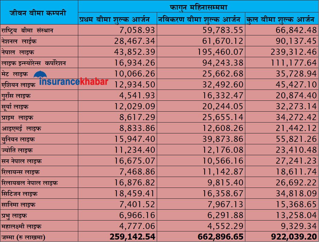 चालु आर्थिक वर्षको ८ महिनामा सबैभन्दा धेरै नेपाल लाइफले मात्रै २३ अर्ब ९३ करोड रुपैयाँ बीमा शुल्क आर्जन गरेको छ । जवको दोस्रो नम्बरमा रहेको लाइफ इन्स्योरेन्स कर्पोरेसनको ११ अर्ब ११ करोड रुपैया रहेको छ । नेपाल लाइफले ४ अर्ब ३८ करोड रुपैयाँ प्रथम बीमा शुल्क आर्जन गर्दा लाइफ इन्योरेन्स कर्पोरेसनको एक अर्ब ६९ करोड रुपैयाँ रहेको छ ।