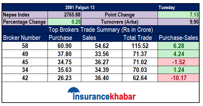 त्यस्तै दोस्रोमा ब्रोकर नम्बर ४९ बाट ३७ करोड ८० लाखको खरिद भएको छ भने ३३ करोड ५६ लाखको बिक्री भएको छ । आज कारोबार गर्ने शिर्ष ५ ब्रोकरमध्ये ३ब्रोकरले खरिद धेरै गरेका छन् भने २ ले बिक्री धेरै गरेका छन्।