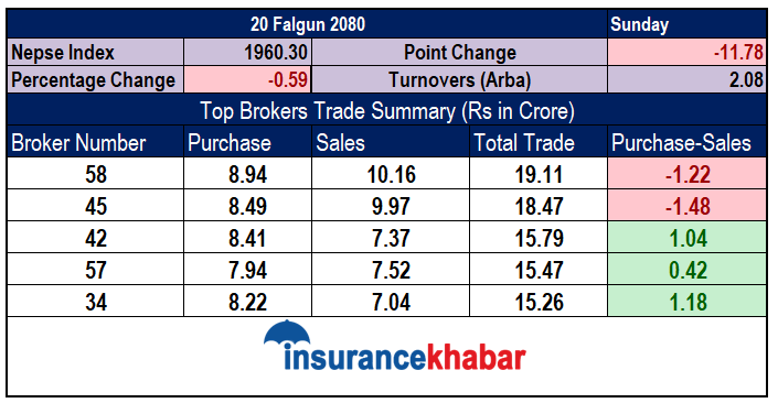 बजारमा २ अर्ब ८ करोड कारोबार भएको दिन ब्रोकर नम्बर ५८ बाट सर्वाधिक रकमको कारोबार भएको छ। ब्रोकर नम्बर ५८ बाट १९ करोड ११ लाखको कारोबार भएको छ। जसमा ८ करोड ९४ लाखको खरिद छ भने १० करोड १६ लाखको बिक्री छ।