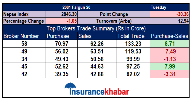 १२ अर्ब ९४ करोड कारोबार भएको दिन ब्रोकर नम्बर ५८ बाट सर्वाधिक रकमको कारोबार भएको छ ।
