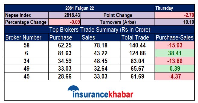 त्यस्तै दोस्रोमा ब्रोकर नम्बर ६ बाट ८१ करोड ६३ लाखको खरिद भएको छ भने ४३ करोड २२ लाखको विक्री भएको छ ।