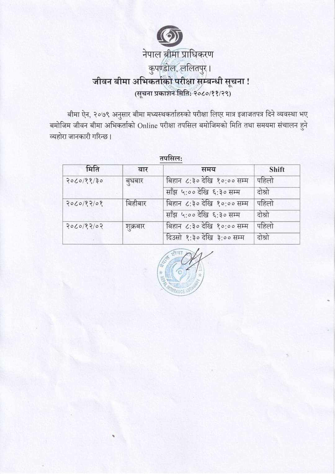 काठमाडौं । नेपाल बीमा प्राधिकरणले फागुन ३० गतेदेखि चैत २ गतेसम्म संचालन हुने जीवन बीमा अभिकर्ताको अनलाइन परीक्षाको समय तालिका सार्वजनिक गरेको छ । प्राधिकरणले बीमा ऐन २०७९ अनुसार जीवन बीमा मध्यस्थकर्ताहरुको परीक्षा लिएरमात्रै इजाजत दिने व्यवस्था भएबमोजिम फागुन ३० गतेसम्म संचालन हुने जीवन बीमा अभिकर्ताको अनलाइन परीक्षाको समय तालिका सार्वजनिक गरेको हो ।