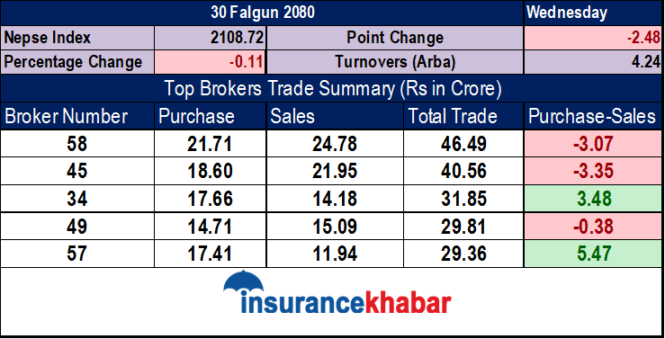 ब्रोकर नम्बर ५८ बाट ४६ करोड ४९ लाखको कारोबार भएको छ जसमा २१ करोड ७१ लाखको खरीद छ भने २४ करोड ७८ लाखको विक्री छ ।