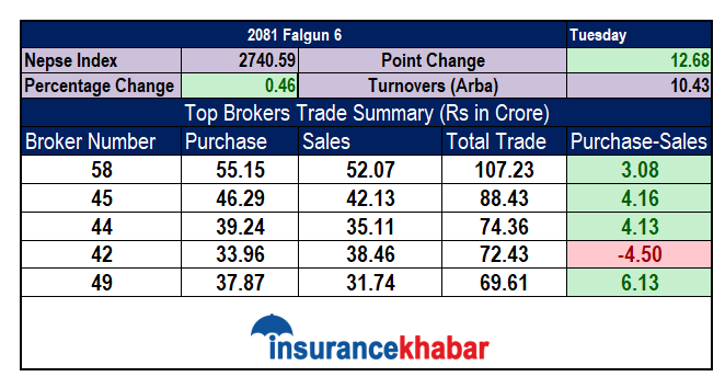 फागुन ६ : नेप्से करिब १३ अंक बढ्दा शीर्ष ५ ब्रोकरबाट खरिद धेरै भएको हो ?