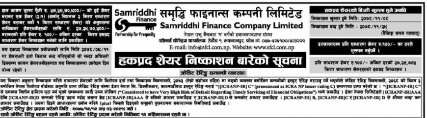 काठमाडौं । समृद्धि फाइनान्स कम्पनी लिमिटेडले फागुन ८ गतेबाट हकप्रद शेयर निष्काशन तथा बिक्री खुल्ला गर्ने भएको छ । फाइनान्सले २ः१ को अनुपातमा अर्थात् हाल कायम २ कित्ता शेयर बराबर नयाँ १ कित्ता शेयरको अनुपातमा १०० रुपैयाँ अंकित दरमा कुल २७ करोड २९ लाख ७० हजार ५ सय रूपैयाँ बराबरको २७ लाख २९ हजार ७ सय ५ कित्ता हकप्रद सेयर निष्काशन गर्न लागेको हो ।