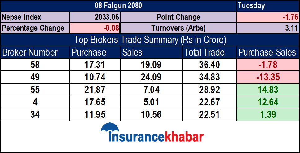 त्यस्तै दोश्रोमा ब्रोकर नम्बर ४९ बाट १० करोड ७४ लाखको खरीद छ भने २४ करोड ९ लाखको विक्री छ । आज कारोबार गर्ने शिर्ष ५ ब्रोकरमध्ये ३ ब्रोकरले खरिद धेरै गरेका छन् भने २ले विक्री धेरै गरेका छन्।