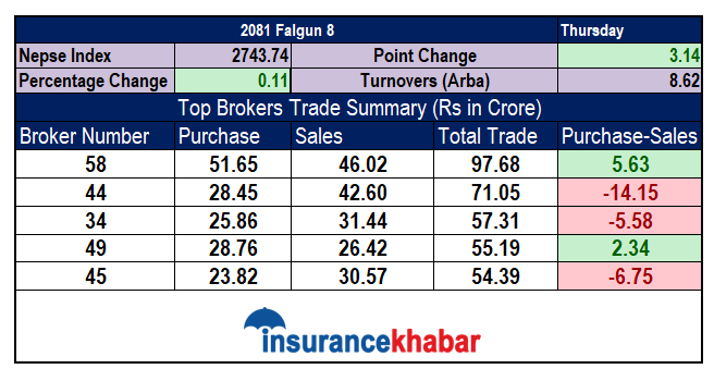 बजारमा ८ अर्ब ६२ करोड रुपैयाँको कारोबार भएको दिन ब्रोकर नम्बर ५८ बाट सर्वाधिक रकमको कारोबार भएको छ। यो ब्रोकरबाट ९७ करोड ६८ लाख रुपैयाँको कारोबार भएको छ। जसमा ५१ करोड ६५ लाख रुपैयाँको खरिद छ भने ४६ करोड २ लाख रुपैयाँको बिक्री छ।