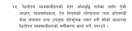 बोर्डले सार्वजनिक गरेको आर्थिक वर्ष २०७५/७६ को नीति तथा कार्यक्रम अनुसार धितोपत्र व्यवसायीहरूको स्तर अभिवृद्धि गर्नकालागि पुँजी आधार, व्यवसायिकता, ऎन नियमको परिपालना तथा प्रतिस्पर्धी सेवालगायत अन्य उपयुत्त परिसूचक तयार गरी सोको आधारमा धितोपत्र व्यवसायीहरूको वर्गीकरण कार्य गर्ने/गराउने कुरा उल्लेख छ ।