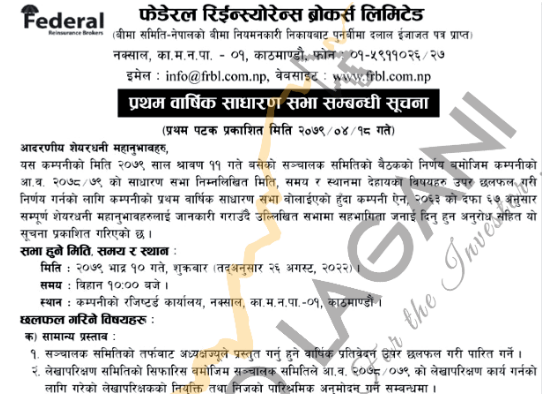 काठमाडौं । फेडेरल रिइन्स्योरेन्स ब्रोकर्स कम्पनी लिमिटेडको वार्षिक साधारणसभा भदौ १० गते हुने भएको छ । सभाले गत आर्थिक वर्षको नाफा, नोक्सान, हिसाब नगद प्रवाह लगायतका विषयमा छलफल गरी पारित गर्नेछ ।
