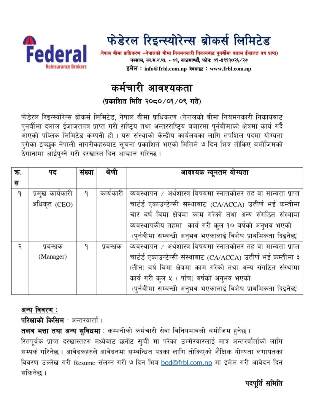 काठमाडौं । फेडेरल रिइन्स्योरेन्स ब्रोकर्स लिमिटेडले कर्मचारी माग गरेको छ । ब्रोकर्सले प्रमुख कार्यकारी अधिकृतका लागि १ जना र प्रबन्धकका लागि १ जना माग गरेको छ । सिइओका लागि व्यवस्थापन, अर्थशास्त्री विषयमा स्नातकोत्तर तह वा मान्यता प्राप्त चार्टर्ड एकाउन्टेन्सी संस्थाबाट सिए वा एसीसीए उत्र्तिण गरी कम्तिमा ४ वर्ष बीमा क्षेत्रमा काम गरेको हुनुपर्ने जनाएको छ भने प्रबन्धक तहका लागि पनि व्यवस्थापन, अर्थशास्त्री विषयमा स्नातकोत्तर तह वा मान्यता प्राप्त चार्टर्ड एकाउन्टेन्सी संस्थाबाट सिए वा एसीसीए उत्र्तिण गरी कम्तिमा ३ वर्ष बीमा क्षेत्रमा काम गरेको हुनुपर्ने जनाएको छ । ईच्छुक तथा योग्यता पुगेकाले सूचना प्रकाशित भएको मितिले ७ दिनभित्र आवेदन दिनुपर्नेछ ।