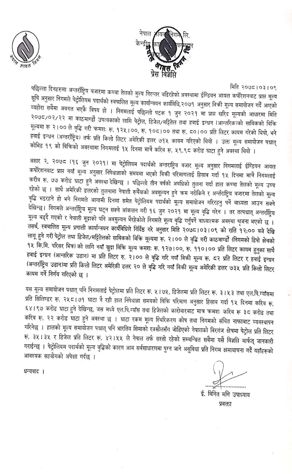 अब पेट्रोलको मूल्य १२७ रुपैयाँ र डिजेलको मूल्य ११० रुपैयाँ पुगेको छ । हवाई इन्धन (आन्तरिक उडान) मा प्रतिलिटर २ रुपैयाँले वृद्धि गरी ८२ रुपैयाँ प्रति लिटर र हवाई इन्धन(अन्तर्राष्ट्रिय उडान)मा प्रति किलोलिटर अमेरिकी डलर २०ले वृद्धि गरेर नयाँ बिक्री मूल्य अमेरिकी डलर ७३५ प्रति किलो लिटर कायम गर्ने निर्णय गरेको निगमले जनाएको छ ।