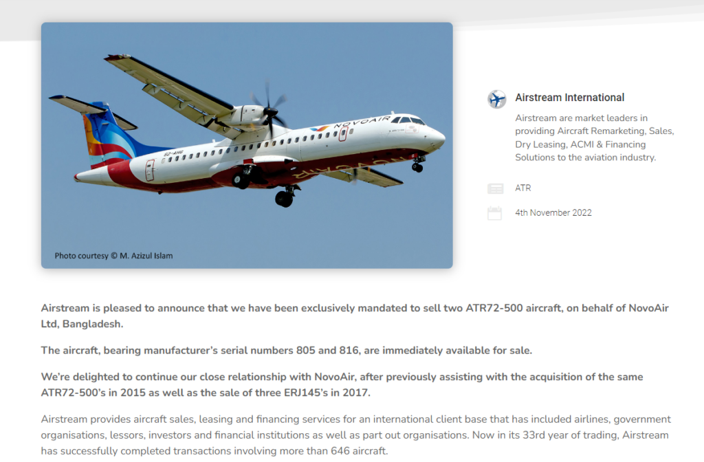 सन् २०१३ देखि बंगलादेशको आकाशमा उडान शुरु गरेको नोभो एयरले सन् २०१७ सम्ममा एटिआर ७२ ५०० र ६०० सिरिजका समेत गरी कूल सातवटा एटिआर विमान खरिद गरेको थियो । यी सबै विमानहरु नोभो एयरले एयरस्ट्रिमको मध्यस्थतामा नै खरिद गरेको हो ।