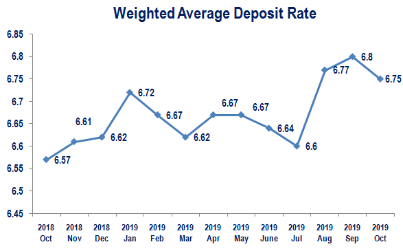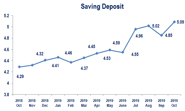 बचतको ब्याज भने बढेको छ । समग्रमा निक्षेपको व्याज भने वृद्धि भएको छ । अक्टोबर २०१८मा वाणिज्य बैंकहरुले निक्षेपमा दिएको भारित औसत व्याज दर ६ दशमलव ५७ प्रतिशत थियो भने २०१९ को अक्टोबर महिना सम्म आउँदा सो दर ६ दशमलव ७५ प्रतिशत पुगेको छ ।