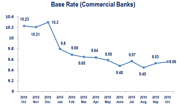 यो एक वर्षको अवधिमा आधार व्याज दरमा गिरावट आएको छ । सन् २०१८ अक्टोबरमा औसत आधार व्याज दर १० दशमलव २३ प्रतिशत रहेकोमा २०१९ अक्टोबर महिना आउँदा सो दर ९ दशमलव ५६ प्रतिशतमा झरेको छ । त्यस्तै कर्जाको व्याज दर पनि घट्न सफल भएको छ । सन् २०१८ अक्टोबरमा १२ दशमलव २६ प्रतिशत रहेको भारित औसत कर्जा दर अहिले २०१९ अक्टोबर आउँदा ११ दशमलव ९८ प्रतिशत पुगेको छ ।