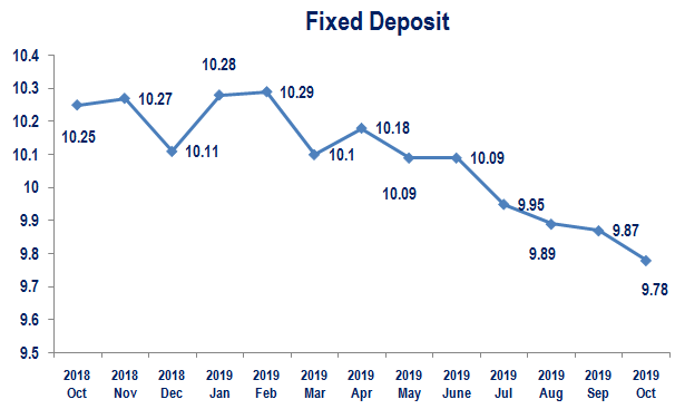तथ्याङ्क अनुसार बचत खातामा दिने ब्याज बढेपनि मुद्दती निक्षेपको व्याज भने घटेको छ । अक्टोबर २०१८ मा वाणिज्य बैंकहरुले मुद्दती खातामा दिएको भारित औसत व्याज दर १० दशमलव २५ प्रतिशत थियो भने २०१९ को अक्टोबर महिना सम्म आउँदा सो दर ९ दशमलव ७८ प्रतिशतमा सीमित हुन पुगेको छ ।