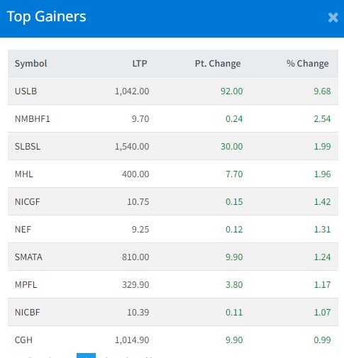 त्यसैगरी आज सबैभन्दा धेरै उन्नती सहकार्य लघुवित्त वित्तीय संस्थाका लगानीकर्ताले कमाएका छन् । कम्पनीका लगानीकर्ताले ९ दशमलव ६८ प्रतिशतका दरले कमाएका हुन् । एनएमबि हाइब्रिट फण्ड एल १ का इकाईधनीले २ प्रतिशतका दरले कमाएका छन् । सामुदायिक लघुवित्तका लगानीकर्ताले १ दशमलव ९९ प्रतिशतका दरले कमाएका छन् । मन्दाकिनी हाइड्रोपावर एनआइसी एशिया ग्रोथ फण्ड लगायतका लगानीकर्ताले कमाएका छन् ।