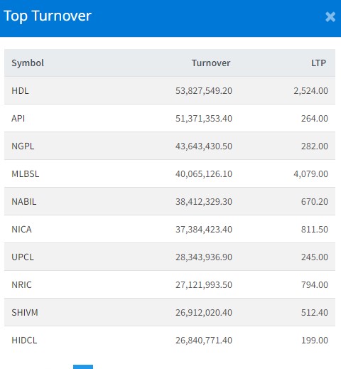आज सबैभन्दा धरै हिमालयन डिष्टिलरीको शेयर कारोबार भएको छ । आज कम्पनीको ५ करोड ३८ लाख रुपैयाँको शेयर कारोबार भएको छ । अपि पावरको ५ करोड १३ लाख रुपैयााको शेयर कारोबार भएको छ । ङादी पावरको ४ करोड ३६ लाख रुपैयाँको शेयर कारोबार भएको छ ।