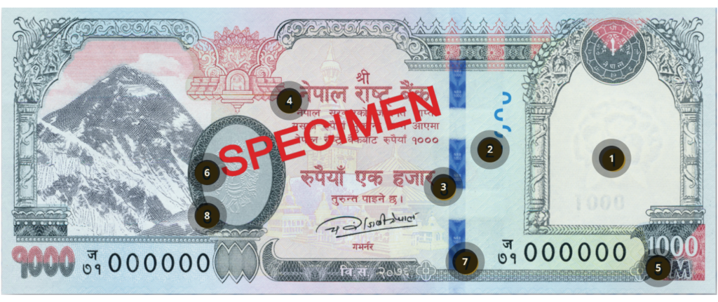 एक हजार दरका सक्कली नाेटकाे मुखपृष्ठतर्फ आठवटा र पछाडीकाे पृष्ठमा ३ वटा सुरक्षा संकेतहरू राखिएका हुन्छन्। यी सुरक्षा संकेतहरू हेरेर र छामेर थाहा पाउन सकिन्छ।