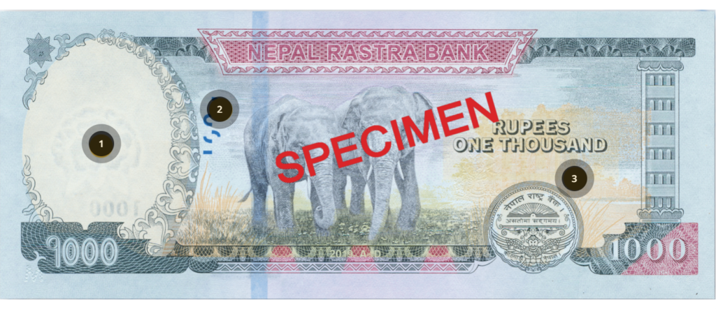 नोटलाई उज्यालो प्रकाशतर्फ राखेर हेर्दा अथवा नोटको पछाडिबाट बत्ती वा घामकाे उज्यालाेकाे माध्यमबाट नोटमा प्रकाश पार्दा लालीगुँरासको पानी छाप स्पष्ट देखिन्छ । नोटको अग्रभागमा भएकाे नोटको नम्बर, सगरमाथाको चित्र र गभर्नरको दस्तखत र पृष्ठ भागमा हात्ती भएको भाग नाेटकाे दुबै तर्फबाट हेर्दा उत्तिकै स्पष्ट देखिन्छ ।