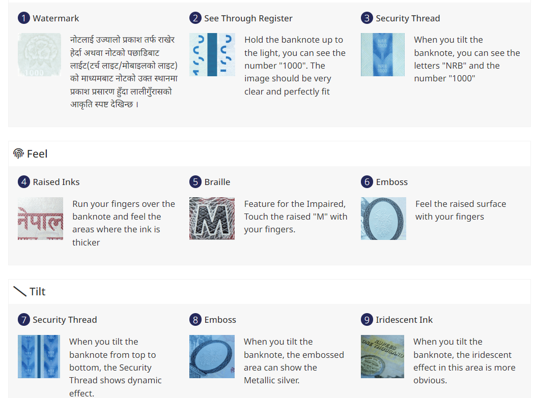 १) कागजकाे गुणस्तरः नाेटकाे काराेबार गर्दा थाेरै पनि सावधानी अपनाउन सकियाे भने ठगिनबाट जाेगिन सकिन्छ। नक्कली नाेट पहिचान गर्ने सबैभन्दा सहज तरिका नाेटकाे लागी प्रयाेग भएकाे कागज गुणस्तर छामेर थाहा पाउने हाे । सक्कली नाेटलाई कच्याचकुचुक्क पारेर पुनः सिधा पार्दा लगभग पहिलेकै अवस्थामा फर्किन्छ, नाेटकाे कागजमा मुजा थाेरै मात्र देखा पर्छ। नक्कली नाेटलाई कच्याचकुचुक्क पारेर पुनः साेझ्याउँदा कागजमा धेरै मुजा परेकाे देखिन्छ, सक्कली नाेट जस्ताे सफा देखिंदैन। नक्कली नाेटकाे कागजकाे गुणस्तर सक्कली नाेटकाे भन्दा खराब हुन्छ।