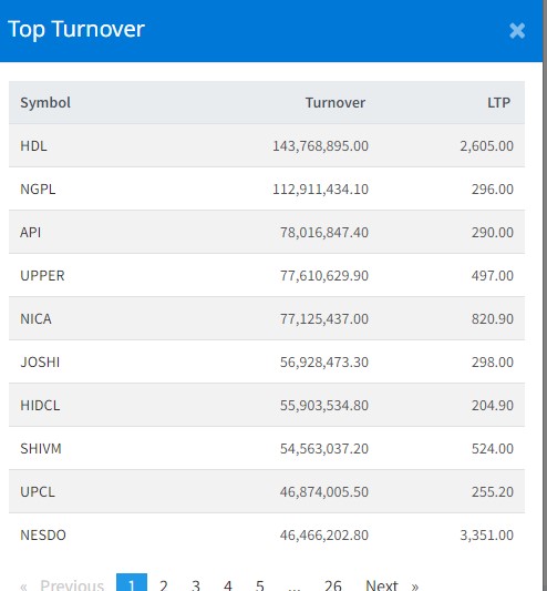 आज दिनभरिमा २५३ कम्पनीको ८१ लाख ३९ हजार ८४० कित्ता शेयर किनबेच हुँदा ३ अर्ब ४ करोड ७७ लाख रुपैयाँको शेयर कारोबार भएको छ । आज सबैभन्दा धेरै हिमालयन डिष्टिलरीको कारोबार भएको छ । आज कम्पनीको १४ करोड ३७ लाख रुपैयाँको शेयर कारोबार भएको छ ।