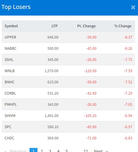 आज अपर तामाकोशीका लगानकिर्ताले गुमाएका छन् । कम्पनीका लगानीकर्ताले ८ दशमलव ३७ प्रतिशतका दरले गुमाएका छन् । नारायणी डेभलपमेन्ट बैंकका लगानकिर्ताले ८ दशमलव २६ प्रतिशतका दरले गुमाएका छन् । शिवम् सिमेन्ट हाइड्रोका लगानकिर्ताले ७ दशमलव ७५ प्रतिशतका दरले गुमाएका छन् ।