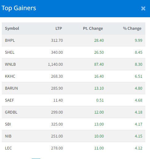 आज ७ अर्ब ६५ हजार रुपैयाँको शेयर कारोबार हुँदा सिङगटी हाइड्रोपावर कम्पनीका लगानीकर्ताले ८ दशमलव ४५ प्रतिशतका दरले कमाएका छन् । विन नेपाल लघुवित्तका लगानीकर्ताले ८ दशमलव ३० प्रतिशतका दरले कमाएका छन् । खानीखोला लघुवित्तका लगानीकर्ताले ६ दशमलव ५१ प्रतिशतका दरले कमाएका छन् ।
