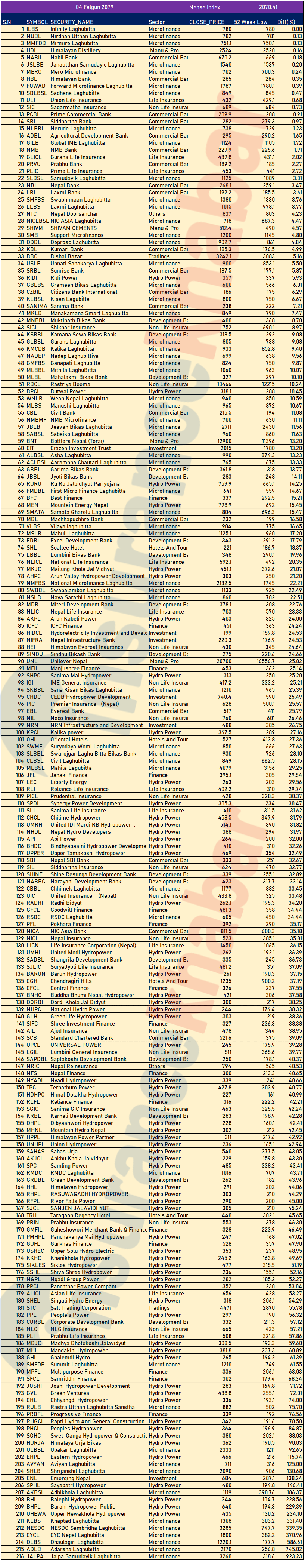 त्यस्तै चौथोमा उत्पादन तथा प्रशोधन क्षेत्रको हिमालयन डिष्टिलरीको बजार मूल्य २५२४ हुँदा कम्पनीको ५२ हप्तासम्मको न्यून मूल्य २५२० रहेको छ ।