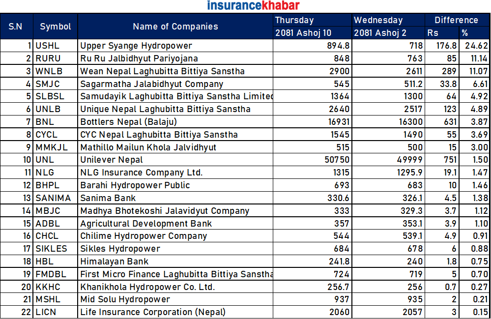 त्यस्तै दोश्रोमा रू रू जलविद्युत् परियोजना लिमिटेडको शेयर मूल्य ११.१४ प्रतिशतले वृद्धि भएको छ । गत साता ७६३ रुपैयाँमा बन्द भएको कम्पनीको बजार मूल्य यो साता ८४८ रुपैयाँमा बजार मूल्य बन्द भएको छ । यो साता कम्पनीको बजार मूल्य प्रति कित्ता ८५ले बढेको छ ।