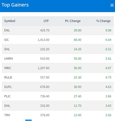 आज सबैभन्दा धेरै इमर्जिङ नेपालका लगानीकर्ताले कमाएका छन् । कम्पनीका लगानीकर्ताले ९ दशमलव ९८ प्रतिशतका दरले कमाएका हुन् । सगरमाथा इन्स्योरेन्स कम्पनीका लगानीकर्ताले ६ दशमलव ६४ प्रतिशतका दरले कमाएका छन् । सोल्टी होटलका लगानीकर्ताले ६ दशमलव ५१ प्रतिशतका दरले कमाएका छन् ।