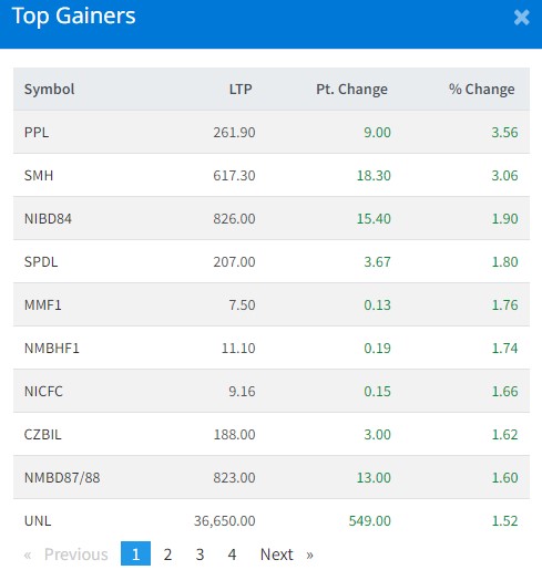 काठमाडौं । आज शेयर बजार नेप्से परिसुचक २६ अंकले घटेर २,१०० को विन्दुमा कायम भएको छ । आज १८ कम्पनीको शेयर मुल्य बढेको छ भने १८९ कम्पनीको शेयर मुल्य घटेको छ । आज सबैभन्दा धेरै पिपुल्स हाइड्रोपावरका लगानीकर्ताले कमाएका छन् । आज यी कम्पनीका लगानीकर्ताले ३ दशमलव ५६ प्रतितशका दरले कमाएका छन् । सुपर माइृ हाइड्रोपावरका लगानीकर्ताले ३ प्रतिशतका दरले कमाएका छन् ।
