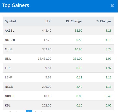 आज सबैभन्दा धेरै आधिँखोला लघुवित्त वित्तीय संस्थाका लगानीकर्ताले कमाएका छन् । कम्पनीका लगानीकर्ताले ८ दशमलव १८ प्रतिशतका दरले कमाएका छन् । एनएमबि ५० का इकाईधनीले ४ प्रतिशतका दरले कमाएका छन् । माउन्टेन हाइड्रोका लगानीकर्ताले ३ दशमलव ७२ प्रतिशतका दरले कमाएका छन् । यूनिलिभर नेपालका लगानीकर्ताले १ दशमलव ९९ प्रतिशतका दरले कमाएका छन् ।