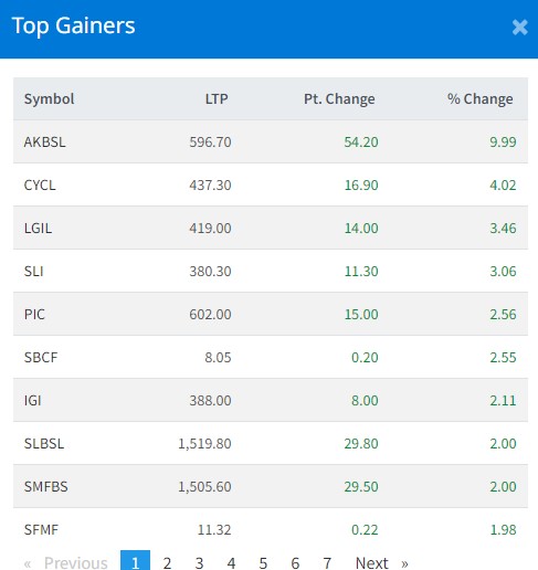 आज सबैभन्दा धेरै आँधिखोला लघुवित्तका लगानीकर्ताले कमाएका छन् । कम्पनीका लगानीकर्ताले ९ दशमलव ९९ प्रतिशतका दरले कमाएका छन् । केवाइसी नेपाल लघुवित्तका लगानीकर्ताले ४ दशमलव ०२ प्रतिशतका दरले कमाएका छन् । लुम्निी जनरल इन्स्योरेन्स कम्पनीका लगानीकर्ताले ३ दशमलव ४६ प्रतिशतका दरले कमाएका छन् । सानिमा लइफका लगानीकर्ताले ३ प्रतिशतका दरले कमाएका छन् ।