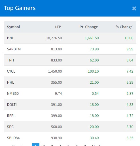 आज सबैभन्दा धेरै बोटलर्स नेपाल बालाजूका लगानीकर्ताले कमाएका छन् । आज यस कम्पनीका लगानीकर्ताले १० प्रतिशतका दरले कमाएका हुन् । सर्वोत्तम सिमेन्टका लगानीकर्ताले ९ दशलमव ९९ प्रतिशतका दरले कमाएका छन् । तारागाँउ रेजेन्सीका लगानीकर्ताले ८ प्रतिशतका दरले कमाएका छन् । सिवाइसी नेपाल लघुवित्तका लगानीकर्ताले ७ प्रतिशतका दरले कमाएका छन् ।