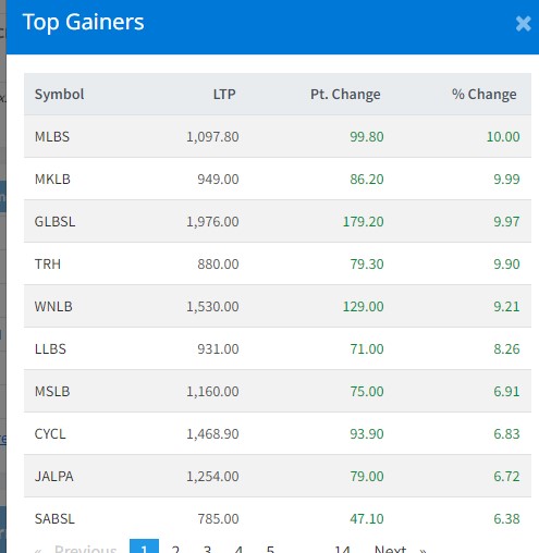आज सबैभन्दा धेरै मानुषि लघुवित्त वित्तीय संस्थाका लगानीकर्ताले कमाएका छन् । आज यस कम्पनीका लगानीकर्ताले १० प्रतिशतका दरले कमाएका छन् । मनकामना स्मार्ट लघुवित्त वित्तीय संस्थाका लगानीकर्ताले ९ दशलमव ९९ प्रतिशतका दरले कमाएका छन् । गुराँस लघुवित्त वित्तीय संस्थाका लगानीकर्ताले ९ दशमलव ९७ प्रतिशतका दरले कमाएका छन् । तारागाउँ रेजेन्सीका लगानीकर्ताले ९ दशमलव ९० प्रतिशतका दरले कमाएका छन् ।