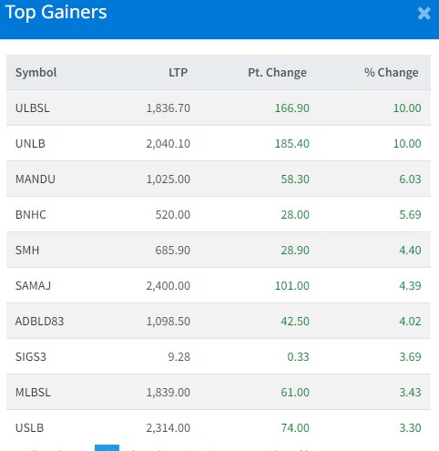 आज सबैभन्दा धेरै उपकार लघुवित्त वित्तीय संस्था र युनिक नेपाल लघुवित्तका लगानीकर्ताले कमाएका छन् । आज यी दुई कम्पनीका लगानीकर्ताले १० प्रतिशतका दरले कमाएका छन् । माण्डु हाइड्रोपावरका लगानीकर्ताले ६ प्रतिशतका दरले कमाएका छन् । बुद्धभुमी हाइड्रोका लगानीकर्ताले ५ दशलमव ६९ प्रतिशतका दरले कमाएका छन् ।