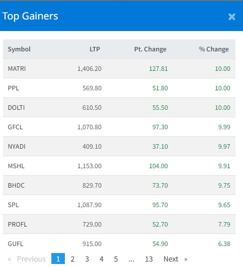 काठमाडौं । आज शेयर बजार नेप्से परिसूचक ८ दशमलव १८ अंकले घटेर २,९२३ को विन्दुमा कायम भएको छ । आज ८० कम्पनीको शेयर मूल्य बढेको छ भने १५७ कम्पनीको शेयर मूल्य घटेको छ । आज सबैभन्दा धेरै मातृभूमी लघुवित्त वित्तीय संस्था, पिपुल्स पावर र दोल्ती पावरका लगानीकर्ताले १० प्रतिशतका दरले कमाएका छन् । गुडविल फाइनान्सका लगानीकर्ताले ९ दशलमव ९९ प्रतिशतका दरले कमाएका छन् । न्यादी हाइड्रोका लगानीकर्ताले ९ दशलमव ९७ प्रतिशतका दरले कमाएका छन् ।