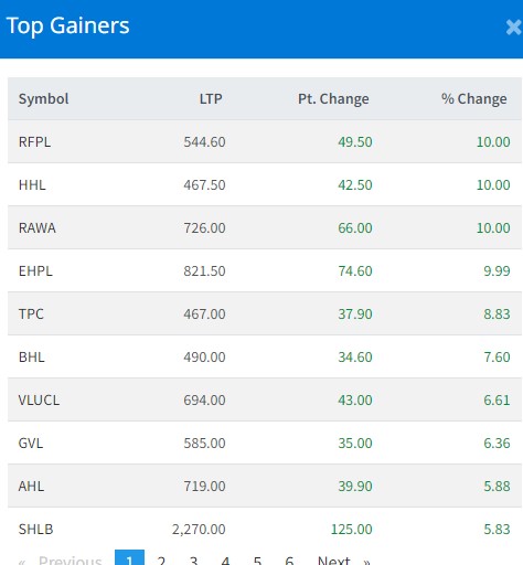 आज सबैभन्दा धेरै रिभर फल्स पावर, हिमालयन हाइड्रोपावर र रावा इनर्जीका लगानीकर्ताले कमाएका छन् । आज यी ३ कम्पनीका लगानीकर्ताले १० प्रतिशका दरले कमाएका हुन् । इस्र्टन हाइड्रोपावरका लगानीर्ताले ९ दशलमव ९९ प्रतिशतका दरले कमाएका छन् ।