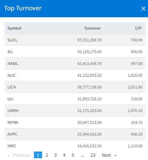 सिद्धार्थ इन्स्योरेन्स कम्पनीको ५ करोड १ लाख रुपैयााको शेयर कारोबार भएको छ । नविल बैंकको ४ करोड २४ लाख रुपैयाँको शेयर कारोबार भएको छ । नेपाल लाइफ इन्स्योरेन्स कम्पनीको ४ करोड ११ लाख रुपैयाँको शेयर कारोबार भएको छ । एलआइसी नेपालको ३ करोड ८७ लाख रुपैयाँको शेयर कारोबार भएको छ ।