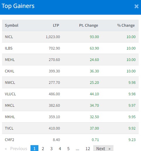 आज सबैभन्दा धेरै नेपाल इन्स्योरेन्स कम्पनी, इन्फिनिटी लघुवित्त, मनकामना इन्जिनियरिङ र चिरख्वा हाइड्रोपावर कम्पनीक ालगानीकर्ताले कमाएका छन् । आज यस कम्पनीका लगानीकर्ताले १० प्रतिशतका दरले कमाएका हुन् । त्यस्तै, चार कम्पनीका लगानीकर्ताले ९ दशलमव ९० प्रतिशतभन्दा बढीका दरले कमाएका छन् ।