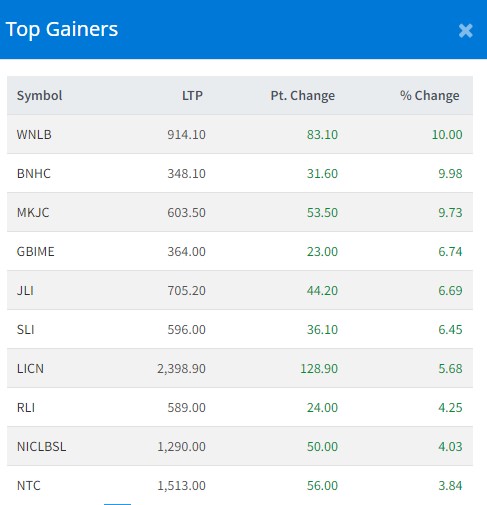 काठमाडौं । आज शेयर बजार नेप्से परिसूचक १० दशमलव ८३ अंकले घटेर २,९२० दशमलव ५१ को विन्दुमा कायम भएको छ । आज विन नेपाल लघुवित्तका लगानीकर्ताले सबैभन्दा धेरै प्रतिशतका दरले कमाएका छन् । कम्पनीका लगानीकर्ताले १० प्रतिशतका दरले कमाएका छन् । बुद्धभुमि हाइड्रोपावर कम्पनीका लगानकिर्ताले ९ दशमलव ९८ प्रतिशतका दरले कमाएका छन् । मैलुङ खोला जलविद्युत कम्पनीका लगानकिर्ताले ९ दशमलव ७३ प्रतिशतका दरले कमाएका छन् ।
