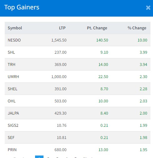 त्यसैगरी आज सबैभन्दा धेरै नेष्डो समृद्ध लघुवित्त वित्तीय संस्थाका लगानीकर्ताले कमाएका छन् । कम्पनीका लगानीकर्ताले १० प्रतिशतका दरले कमाएका छन् । सोल्टी होटलका लगानीकर्ताले ३ दशमलव ९९ प्रतिशतका दरले कमाएका छन् । तारागाउ रेजेन्सीका लगानीकर्ताले ३ दशमलव ९४ प्रतिशतका दरले कमाएका छन् । यूनाइटेड इदी मर्दीका लगानीकर्ताले २ प्रतिशतका दरले कमाएका छन् ।