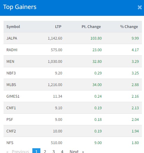 आज सबैभन्दा धेरै जाल्पा सामुदायिक लघुवित्त वित्तीय संस्थाका लगानीकर्ताले कमाएका छन् । कम्पनीका लगानीकर्ताले ९ दशमलव ९९ प्रतिशतका दरले कमाएका हुन् । राद्यी विद्युत कम्पनीका लगानीकर्ताले ४ दशमलव १७ प्रतिशतका दरले कमाएका छन् । माउन्टेन इनर्जी कम्पनीका लगानीकर्ताले ३ प्रतिशतका दरले कमाएका छन् ।